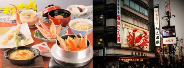 大阪将日本各地螃蟹的做法发挥到了极致,大名鼎鼎的螃蟹专卖店“蟹道乐”,偌大的螃蟹招牌高挂于店门口十分显目,已成大阪的地标。店家全年供应北海道最有名的松叶蟹(雪蟹)、帝王蟹等名物烹制的“日式螃蟹酒席”、“螃蟹火锅套餐”、“炭烧螃蟹套餐”等美食。