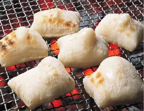 这种年糕约拇指大小的片状,然后穿到12公分长的竹串上,以炭火烘烤,沾上与大豆粉混合的白味噌。
